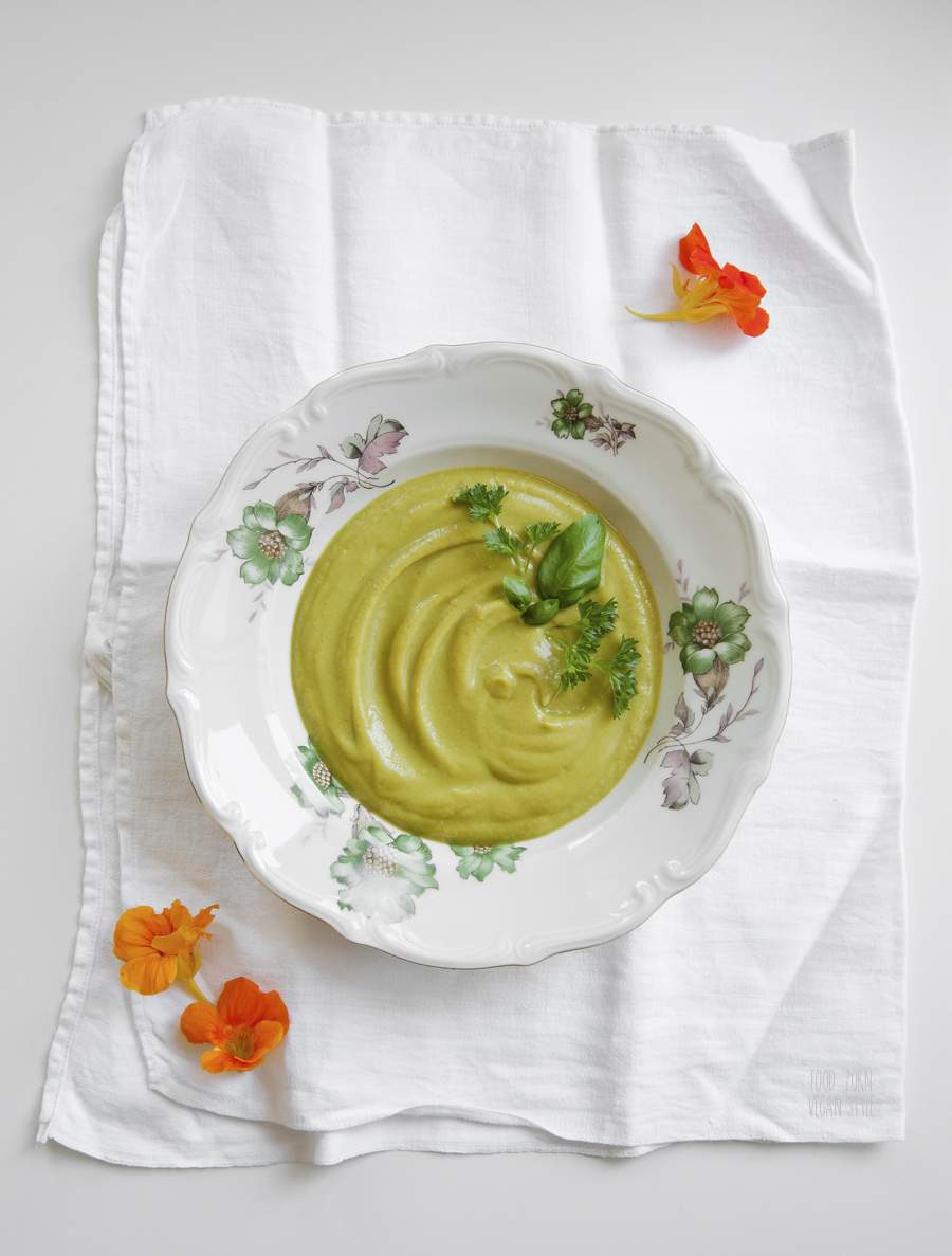 Bardzo prosty krem z bobu i brokuła, ze świeżą bazylią i młodą włoszczyzną.