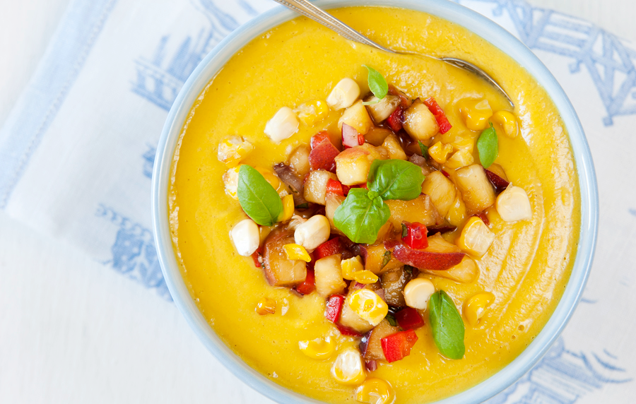 VEGAN CORN CHOWDER WITH PEACH SALSA